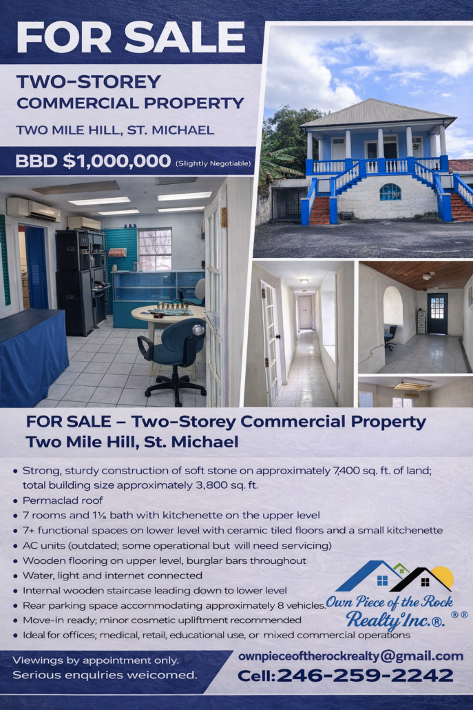 This well-positioned two (2) storey concrete commercial property, constructed of soft stone, is now on the market on the main road at Two Mile Hill, St. Michael, offering excellent visibility and accessibility.